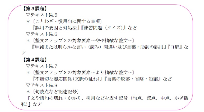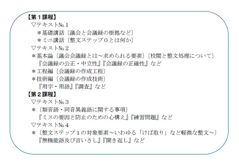 教材は、速記者の視点から協会が独自に開発した8本のテキストと2つの関連資料で、会議録作成上の様々な課題を取り上げて、それらに係る基本的な捉え方や処理の具体例、練習問題とその解説などを示しています。